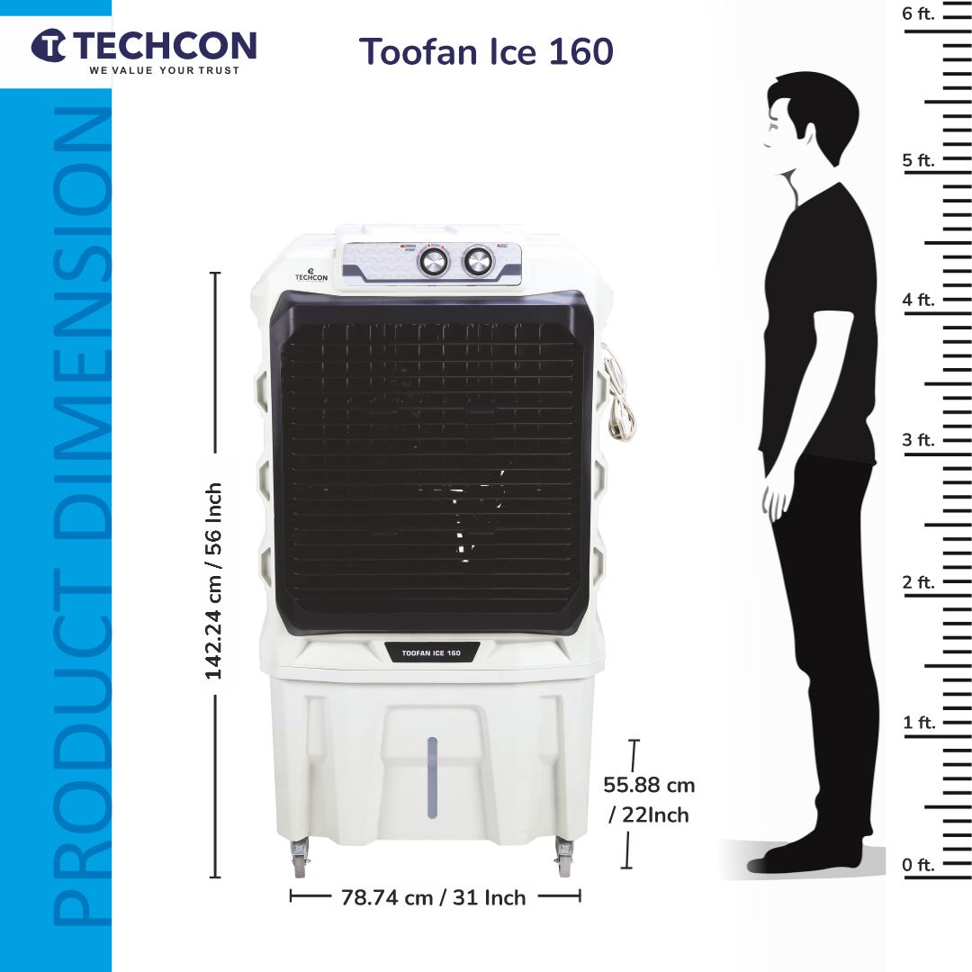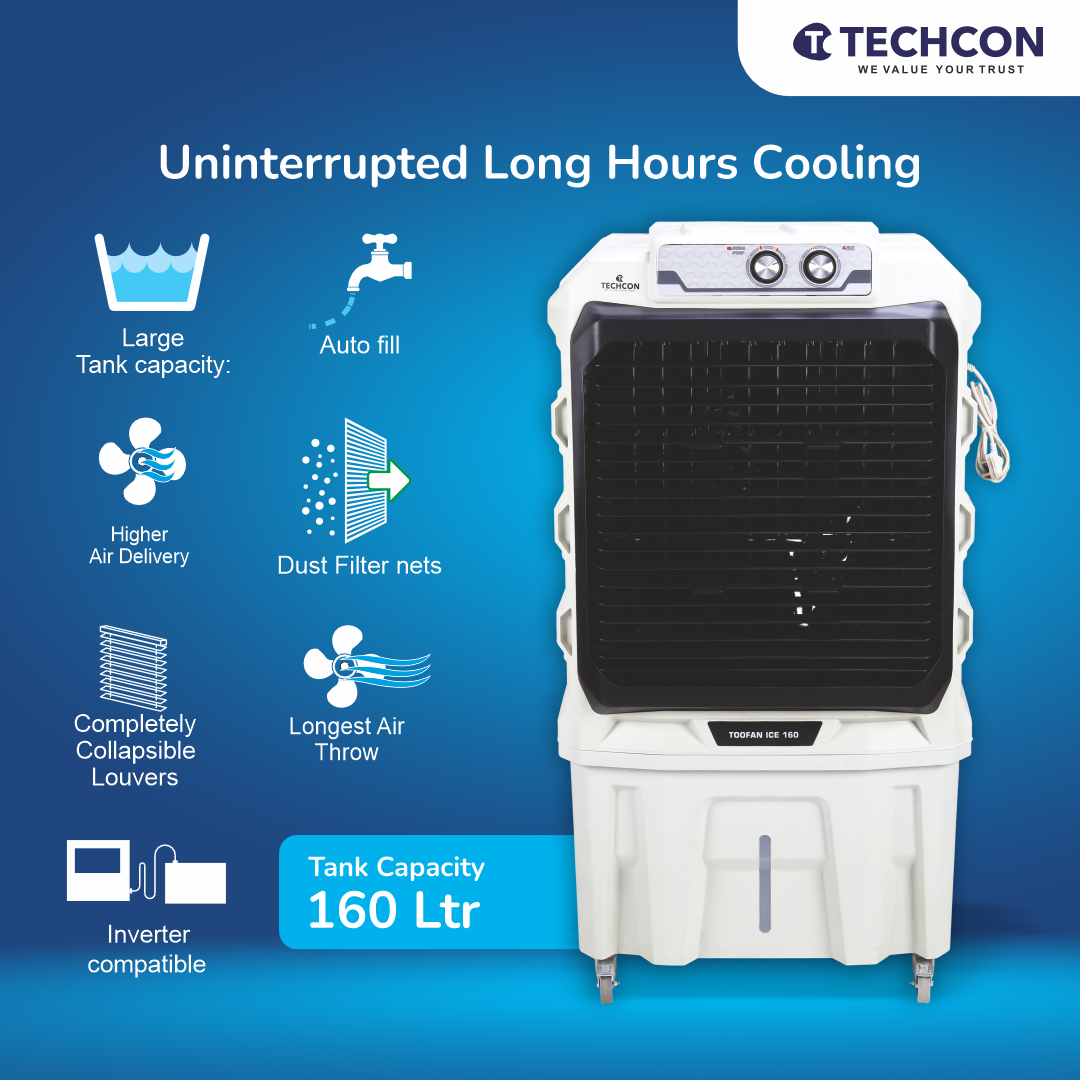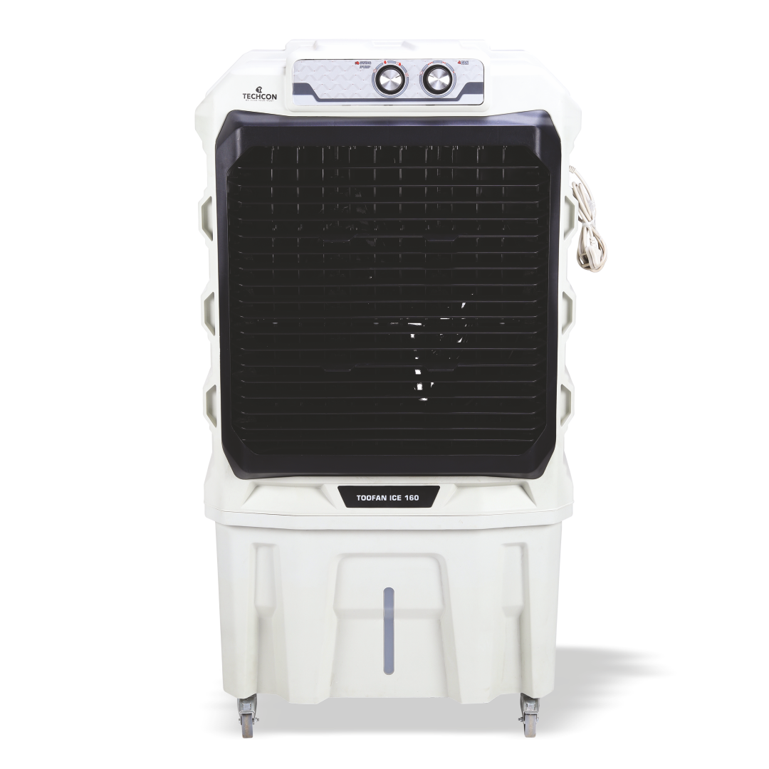 Be the first to review “Techcon Toofan Ice 160 Air Cooler – 160L Tank, Honeycomb Pads, High Air Throw, Inverter Compatible”