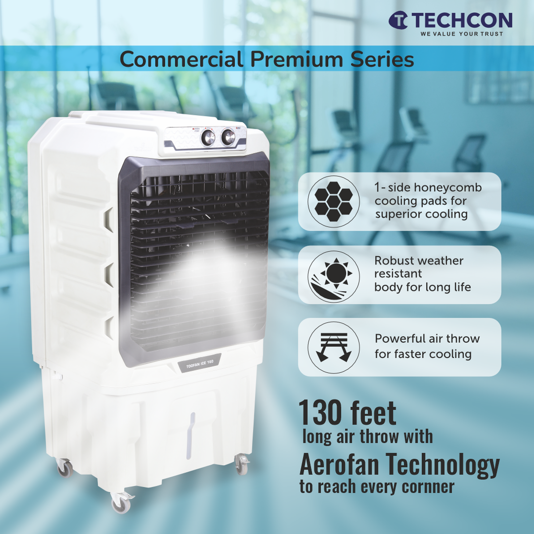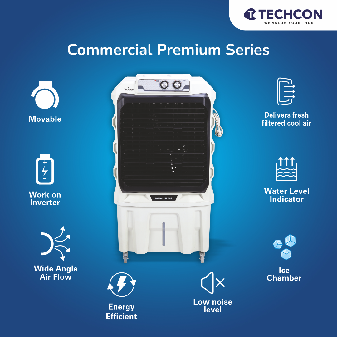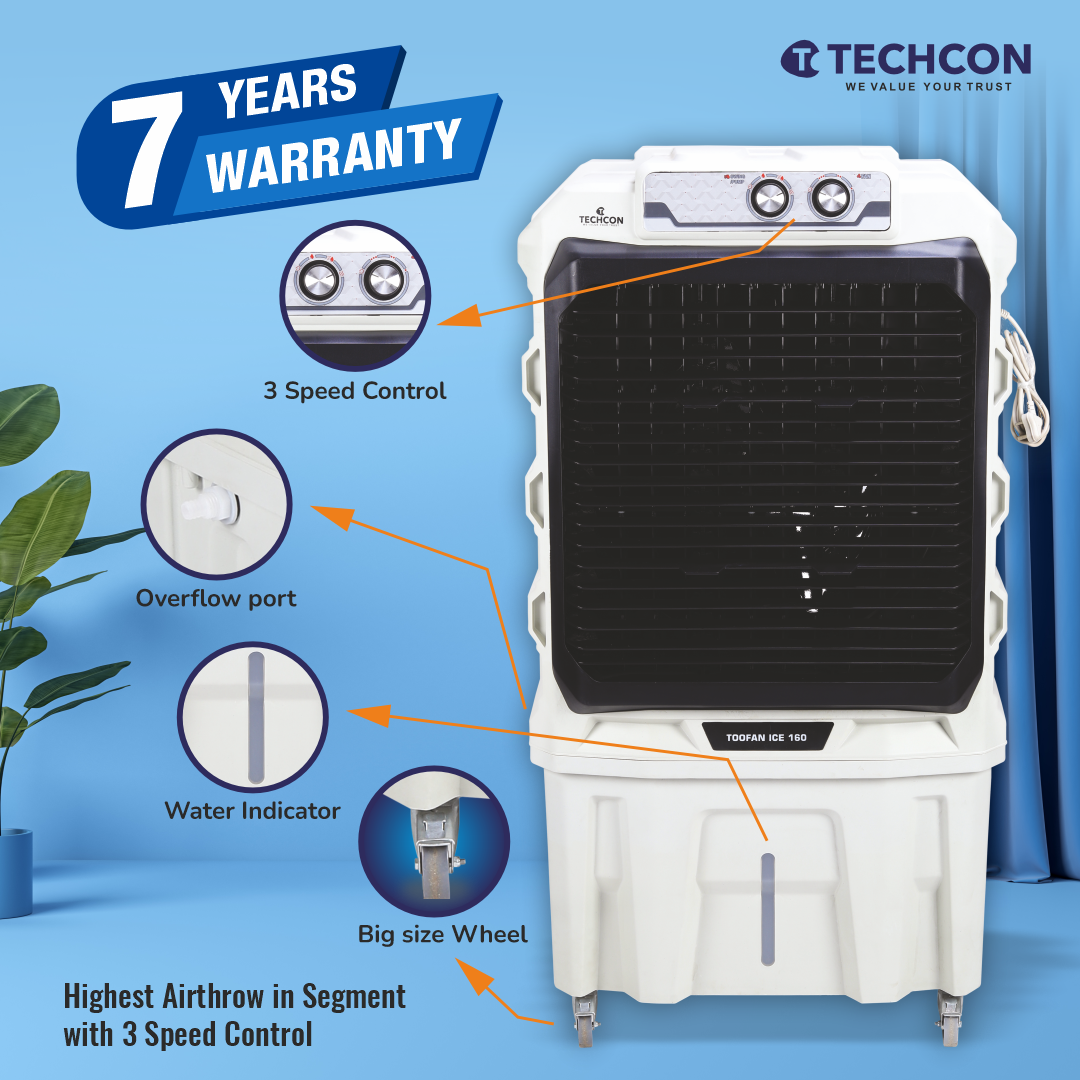 Be the first to review “Techcon Toofan Ice 160 Air Cooler – 160L Tank, Honeycomb Pads, High Air Throw, Inverter Compatible”